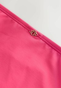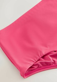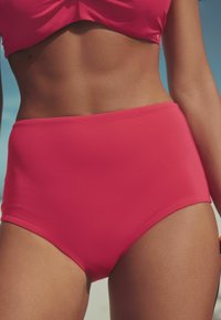 Femme portant un bas de bikini taille haute rose vif assorti à un haut, devant un ciel bleu clair en extérieur.