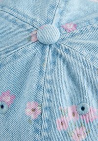 Casquette de baseball en jean bleu clair avec de petites fleurs brodées en violet, rose, jaune et blanc réparties sur toute sa surface.