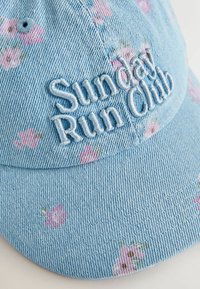 Casquette de baseball en denim bleu clair avec de petits motifs floraux roses et le texte brodé en blanc "Sunday Run Club" sur le devant.