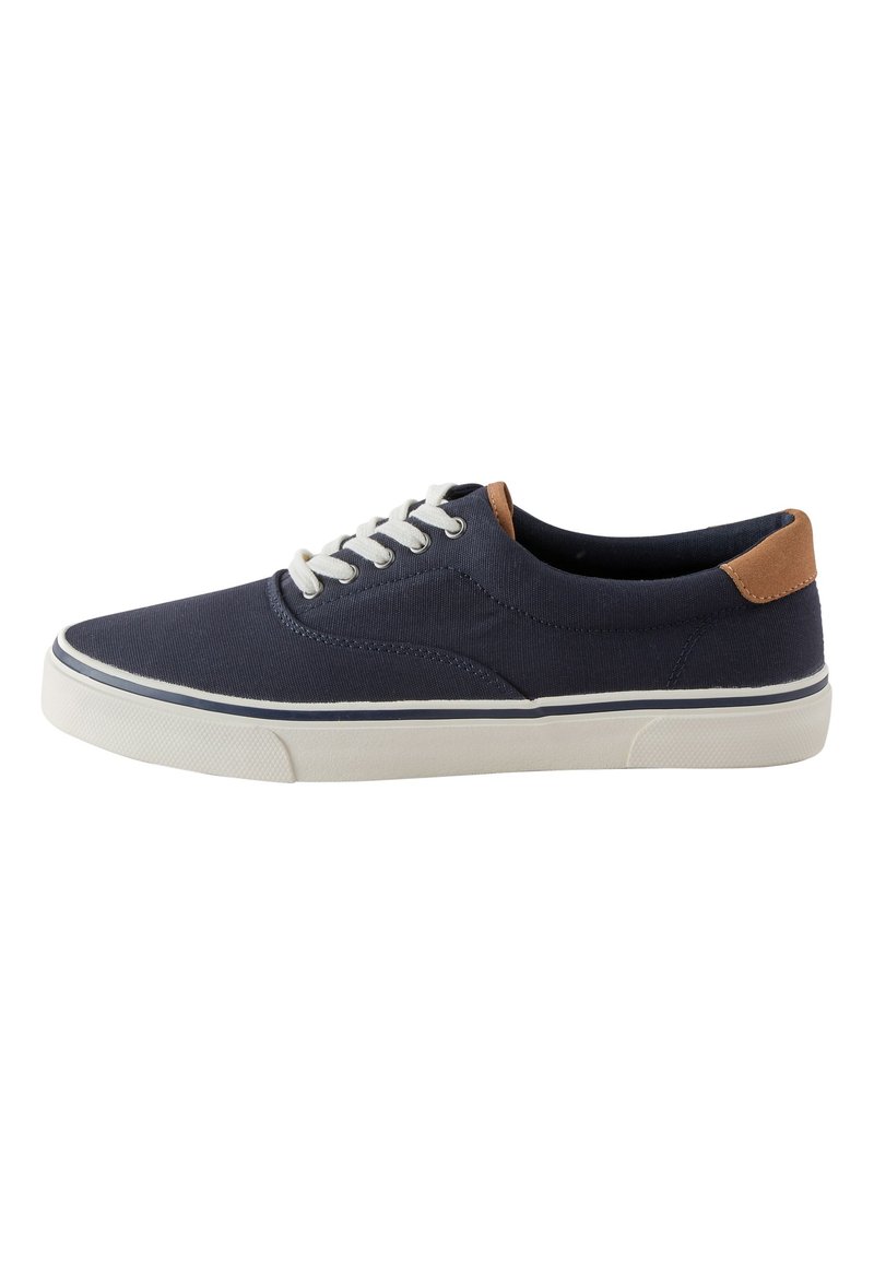 Baskets basses en toile bleu marine avec lacets blancs, semelle en caoutchouc blanche et détail en daim marron au talon, vues de profil.