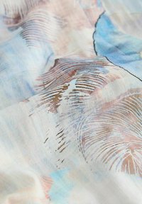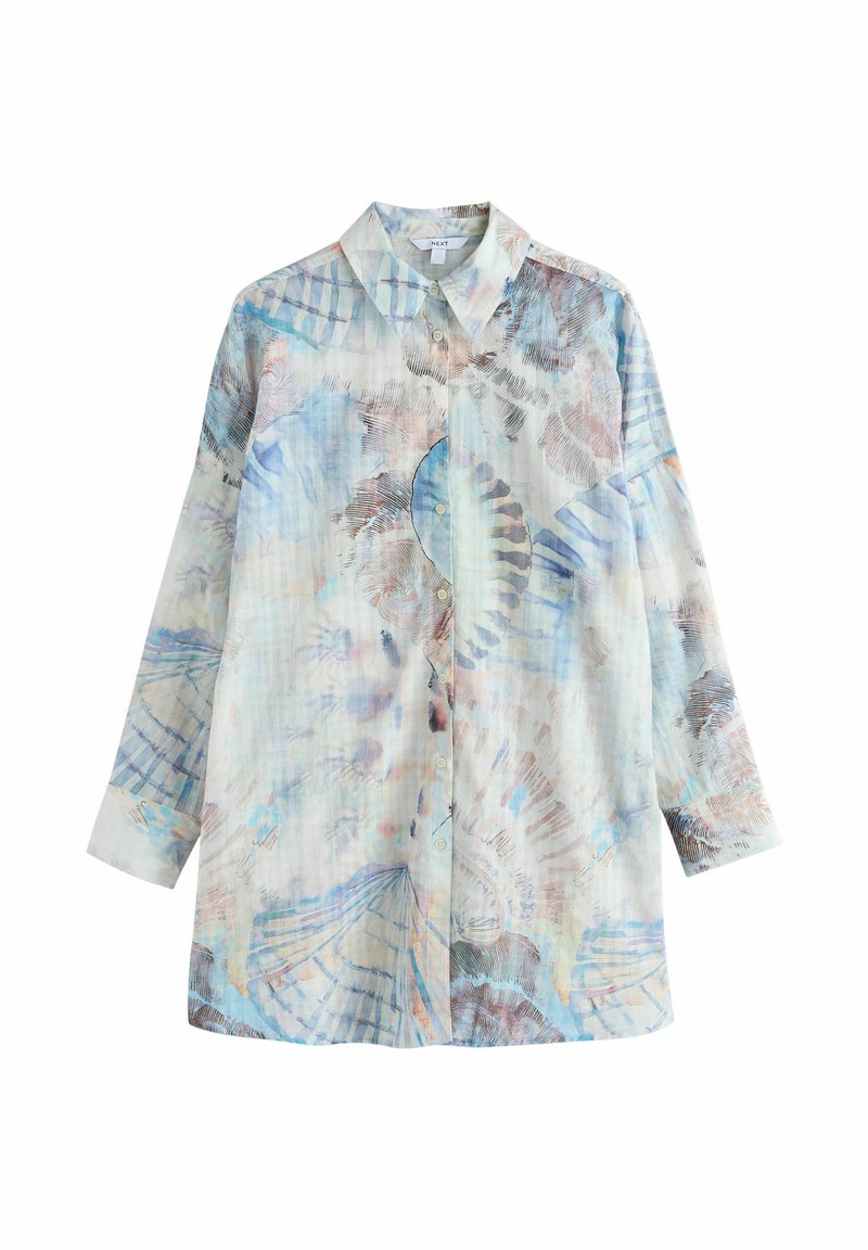 Chemise à manches longues boutonnée avec des motifs aquarelle de coquillages et des motifs abstraits dans des tons bleus, beiges et marron.