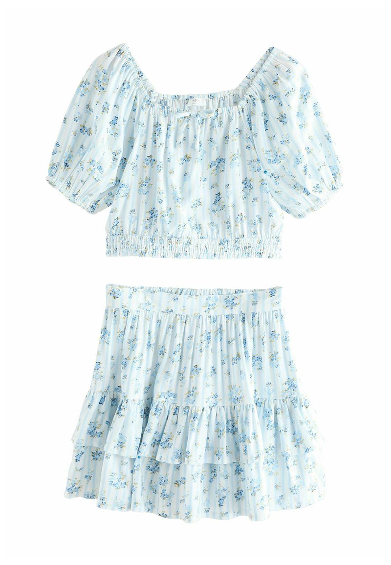Ensemble deux pièces composé d'un crop top bleu clair à imprimé floral avec manches bouffantes et d'une jupe assortie à volants, tous deux en tissu doux.