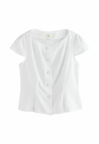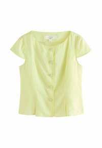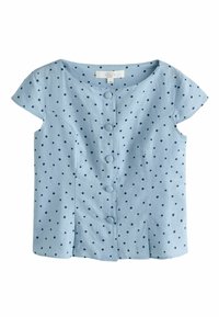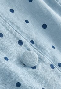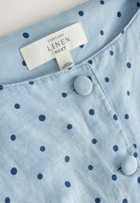 Blouse bleu clair à manches courtes avec des pois bleu marine et des boutons recouverts de tissu sur le devant, en mélange de lin.