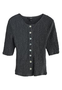 Cardigan en maille texturée vert olive avec sept boutons blancs, col rond et manches trois-quarts sur fond blanc.
