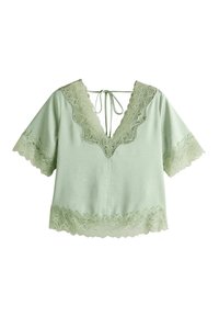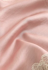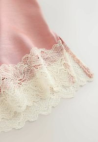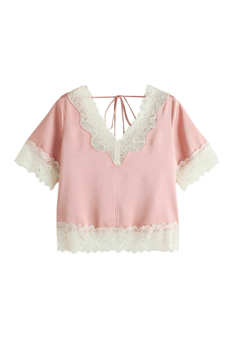 Blouse rose à manches courtes avec bordure en dentelle blanche sur le col en V, les manches et l'ourlet, avec une fermeture à nouer dans le dos.