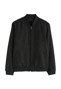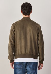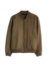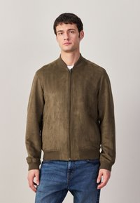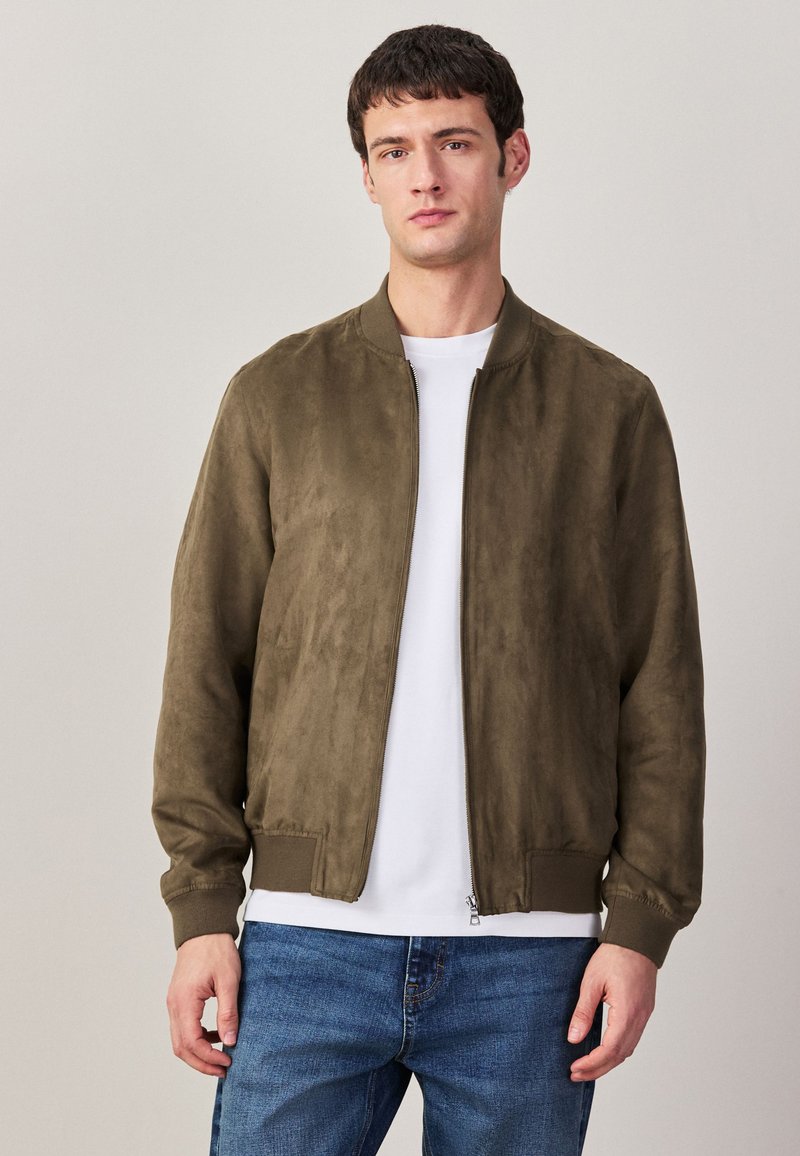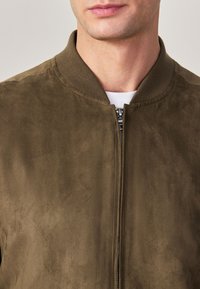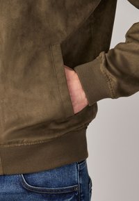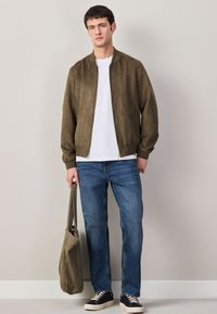 Homme portant une veste bomber marron sur un t-shirt blanc et un jean bleu, debout devant un fond clair uni.