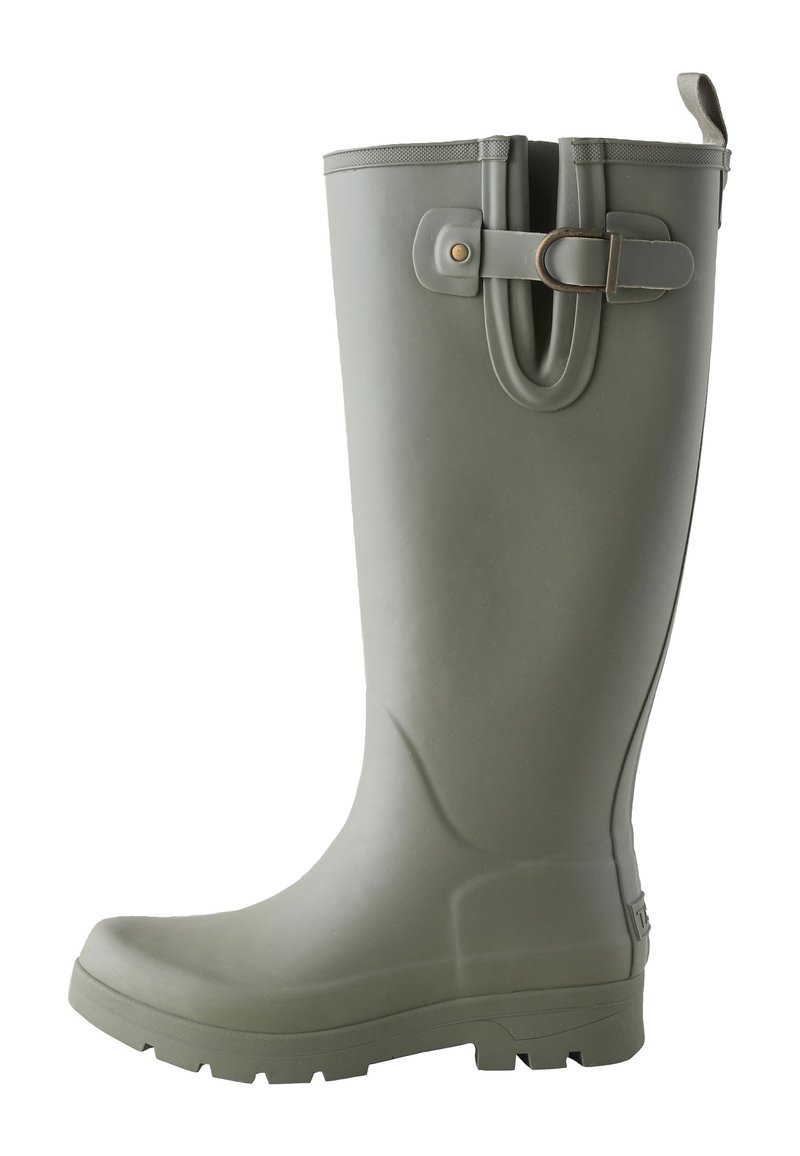 Botte de pluie haute en caoutchouc vert olive avec sangle réglable et boucle près du haut, semelle texturée et languette à l’arrière.