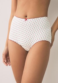 Sous-vêtement blanc taille haute avec petit motif de cœurs rouges et bordure rouge, porté sur un torse féminin de la taille aux cuisses supérieures.
