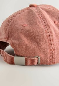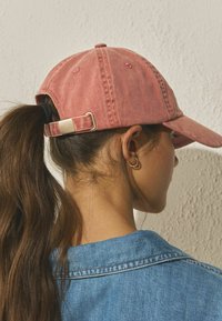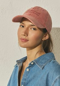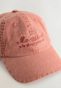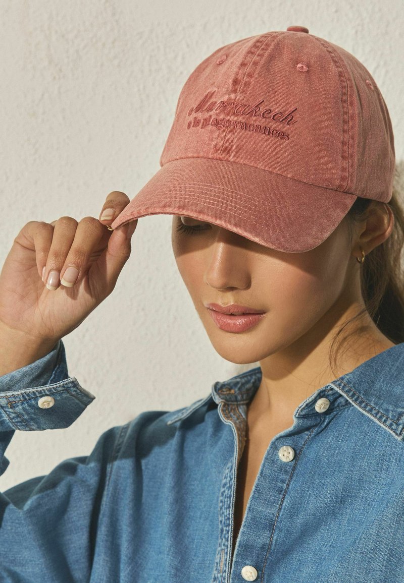 Femme portant une casquette rose délavée avec le texte « Marrakech », vêtue d'une chemise en denim bleue, inclinant la visière de sa casquette de la main droite.