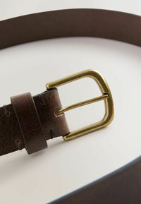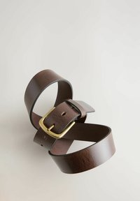 Ceinture en cuir marron foncé avec une boucle en laiton, roulée et posée sur un fond blanc.