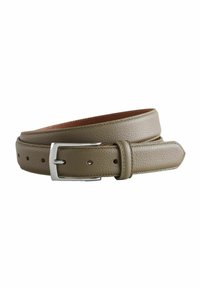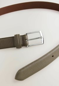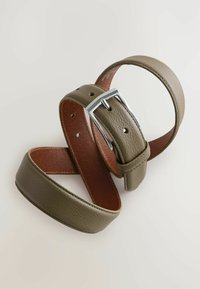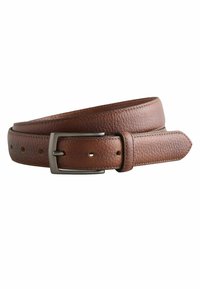 Ceinture en cuir marron texturé avec boucle rectangulaire en métal argenté, roulée sur un fond blanc.