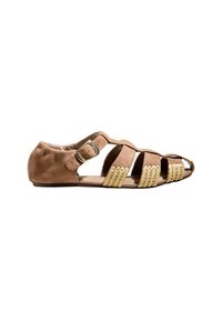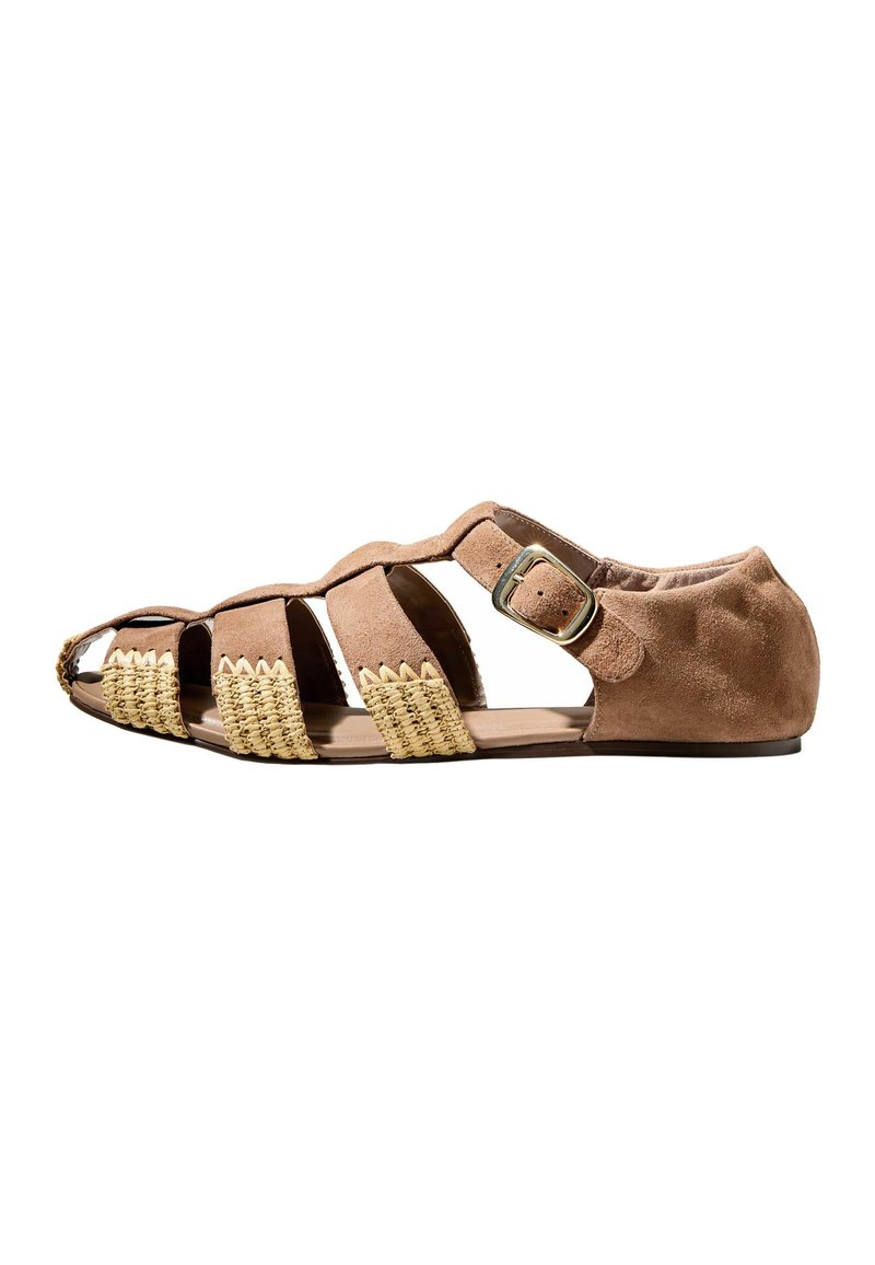 Sandale plate en daim marron avec détails tissés beiges, bout ouvert, multiples brides, et boucle dorée sur le côté.