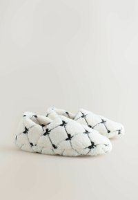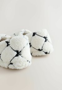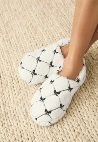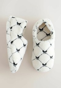 Des chaussons moelleux blancs avec des motifs de nœuds noirs, présentant un extérieur doux et texturé. Forme arrondie, dos ouvert et intérieur rembourré.