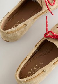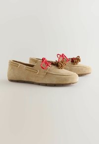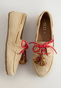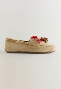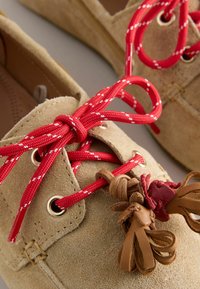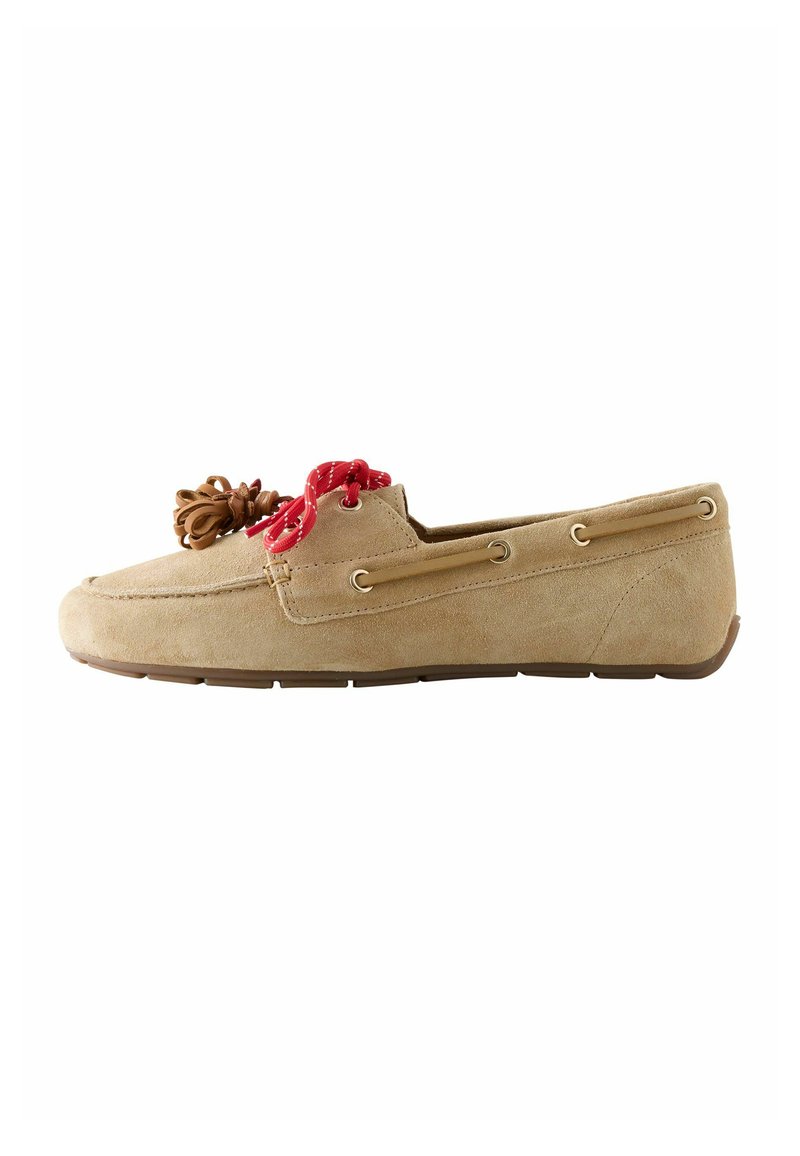 Mocassin en daim beige avec des lacets décoratifs rouges et marron, couture moc toe et semelle en caoutchouc, présenté en profil.