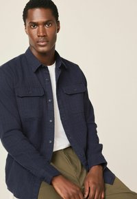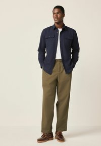 Chemise bleu marine à boutons avec deux poches poitrine, tissu texturé et col classique. Portée sur un t-shirt blanc et associée à un pantalon olive.