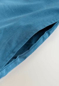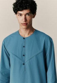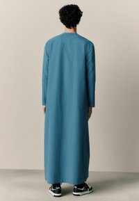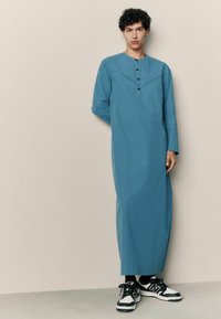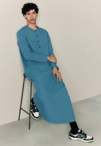 Tunique longue bleu uni avec un col rond, une patte de boutonnage à trois boutons et des manches longues, associée à des chaussures de sport noires et blanches.