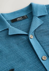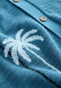 Chemise en maille à manches courtes bleue avec col et boutons, présentant des motifs de palmiers noirs et blancs sur les côtés avant.