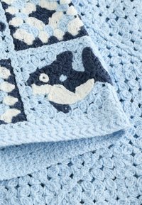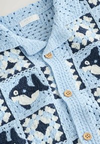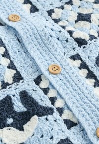 Cardigan à manches courtes en crochet bleu clair avec fermeture à boutons, présentant des carrés alternés de motifs orque et floraux.