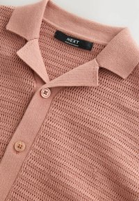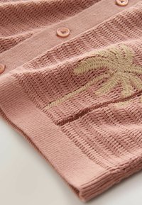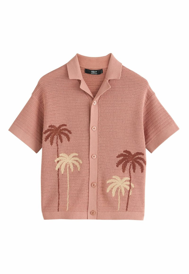 Chemise en maille à manches courtes avec boutons, de couleur rose poudré, ornée de motifs de palmiers en crème et marron sur le devant.