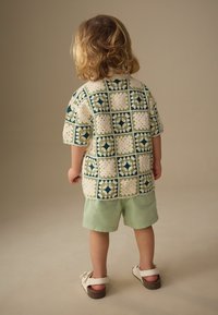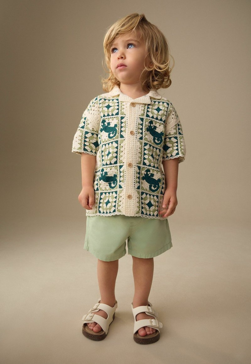 Tout-petit aux cheveux blonds portant une chemise à motifs boutonnée, un short vert clair et des sandales blanches, debout devant un fond neutre.