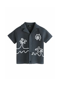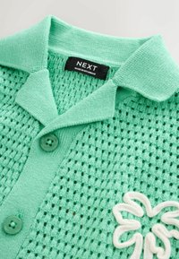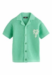 Chemise tricotée manches courtes vert menthe avec motif texturé et écusson blanc de palmier sur la poitrine gauche.