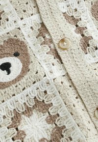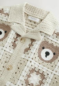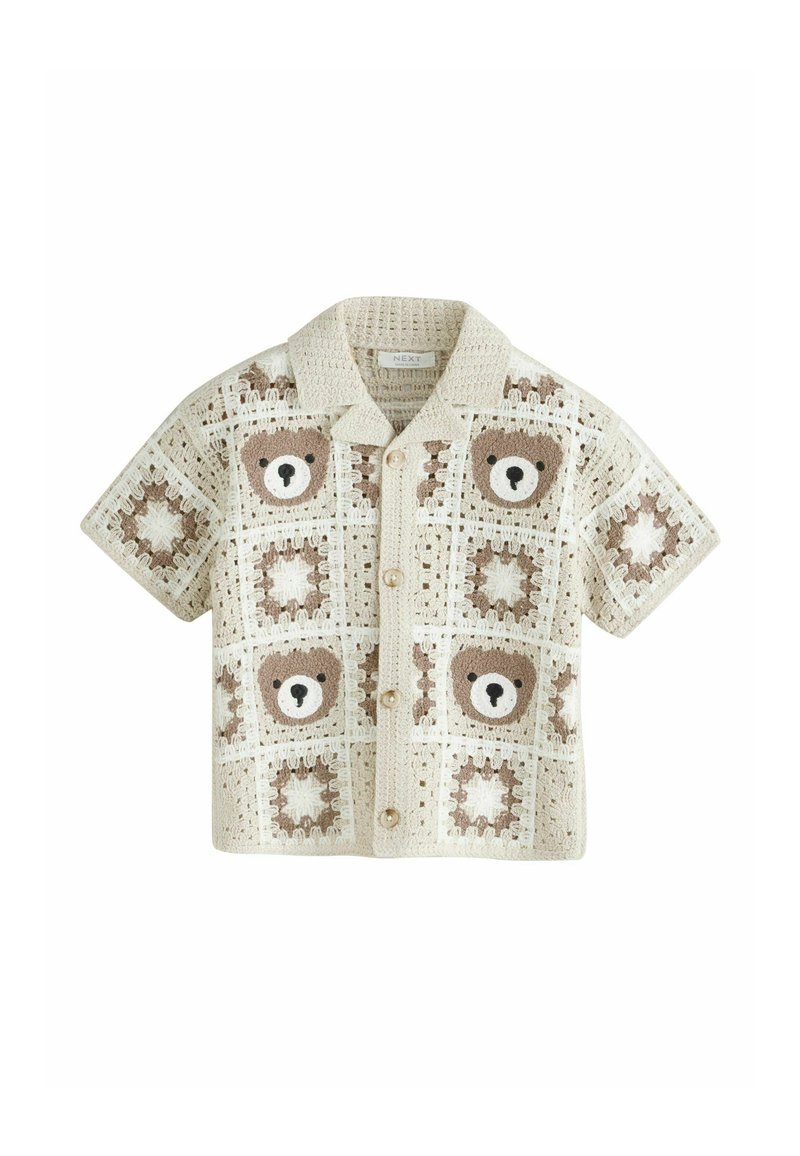 Chemise beige en crochet à manches courtes avec fermeture à boutons, présentant des motifs de visage d'ours marron et blanc ainsi que des étoiles dans des carrés.