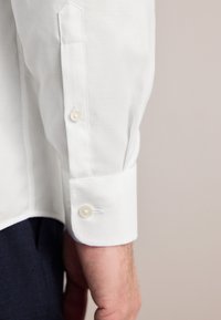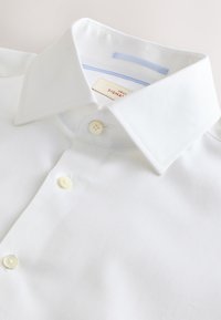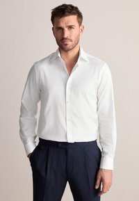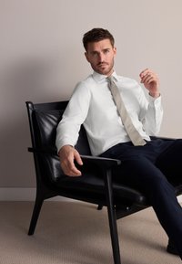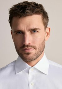 Homme aux cheveux bruns courts portant une chemise blanche boutonnée et un pantalon bleu foncé, debout avec une main dans la poche.