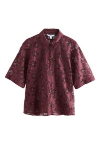 Chemise boutonnée en dentelle de couleur crème avec des motifs floraux, associée à un jean en denim foncé à jambes larges et des mules à talons à motif peau de serpent.