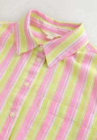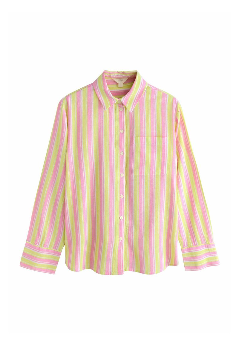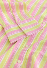 Chemise à manches longues boutonnée avec des rayures verticales roses, jaunes et blanches et une poche poitrine unique.
