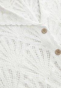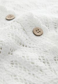 Cardigan blanc à manches courtes en dentelle avec bords festonnés, motif floral, boutons marron et col pointu.