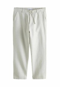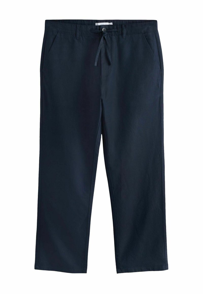 Pantalon décontracté bleu marine à jambes droites, poches avant, fermeture par bouton et cordon de serrage à la taille.