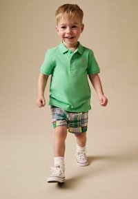 Tout-petit souriant marchant vers l'avant, portant un polo vert, un short à carreaux, des chaussettes blanches et des baskets blanches sur un fond beige uni.