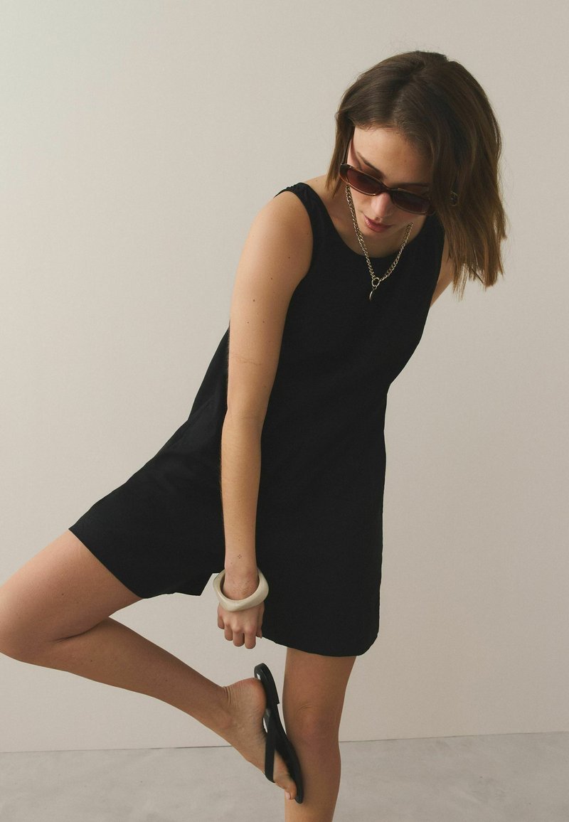 Femme portant une robe noire sans manches et des lunettes de soleil, tenant une sandale noire tout en se tenant en équilibre sur un pied sur un fond uni.