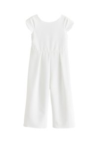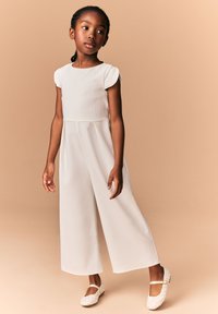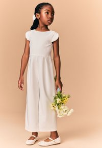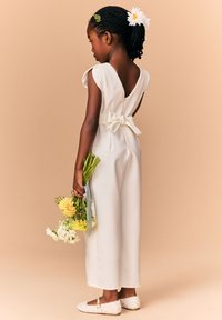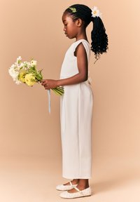 Jeune fille en robe blanche tenant un bouquet de fleurs jaunes et blanches sur fond beige.