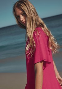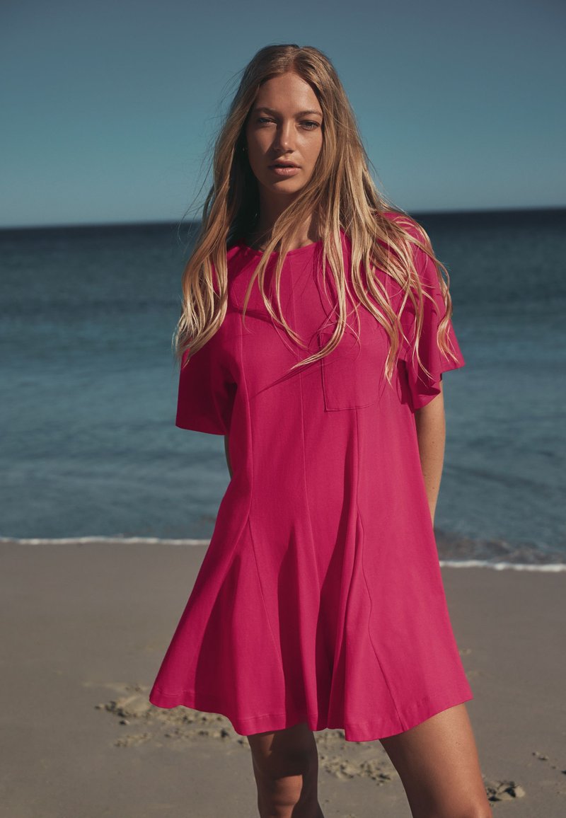 Jeune femme aux longs cheveux blonds portant une robe ample rose vif, debout sur une plage de sable avec un océan calme en arrière-plan.