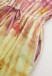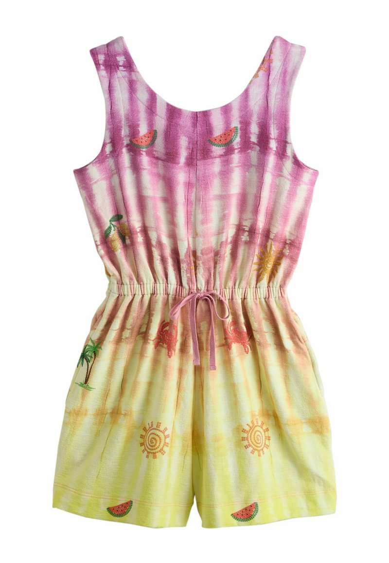 Combinaison sans manches tie-dye avec des teintes roses et jaunes, taille élastique, cordon de serrage, et imprimés de pastèques, soleils, palmiers, crabes, et citrons.
