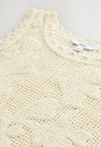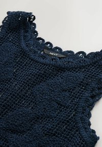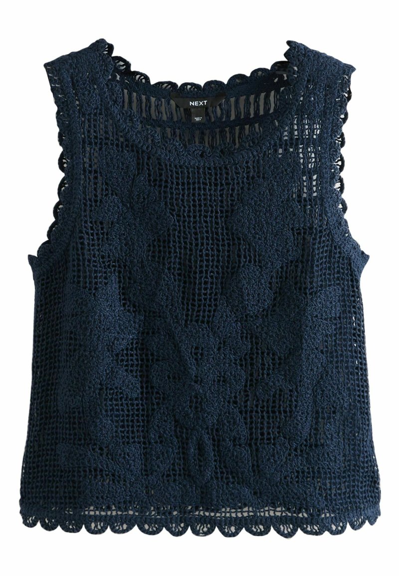 Haut sans manches en crochet bleu marine avec motifs floraux et bords festonnés, étiquette "NEXT" au niveau de l'encolure.