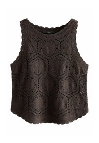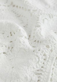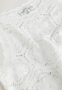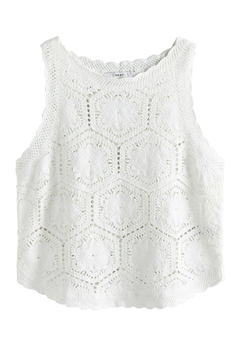 Haut blanc sans manches en crochet avec des bords festonnés et des motifs floraux hexagonaux, doté d'un col rond et de détails en dentelle.