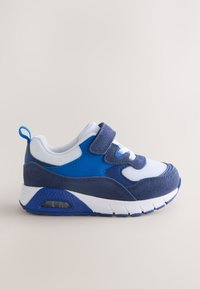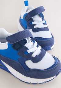 Baskets enfant bleu et blanc avec bride Velcro, panneaux en mesh et suède, semelle épaisse et languette au talon.