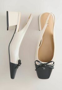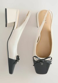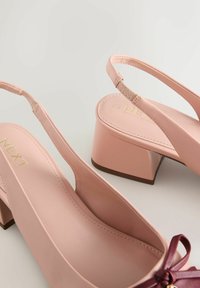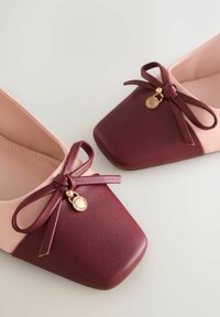 Chaussures slingback en cuir verni rose et bordeaux avec un bout pointu, un petit nœud décoratif et un talon bloc épais.