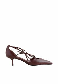 Chaussure en cuir bordeaux à bout pointu et petit talon, avec des brides croisées à la cheville nouées en un nœud, vue de côté sur fond blanc.