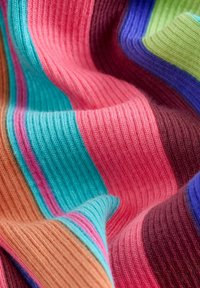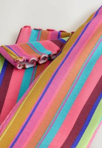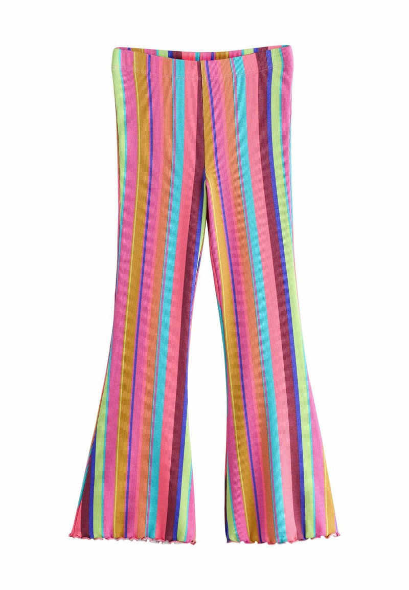 Pantalon évasé à rayures verticales rose, bleu, vert, jaune et violet, avec une texture côtelée et des ourlets à effet ondulé.