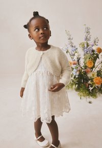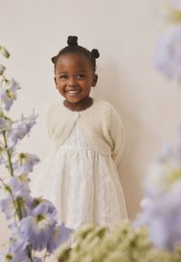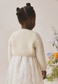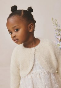 Jeune fille avec deux chignons portant un cardigan blanc duveteux par-dessus une robe en dentelle florale, regardant légèrement sur le côté sur un fond neutre.