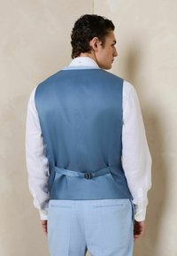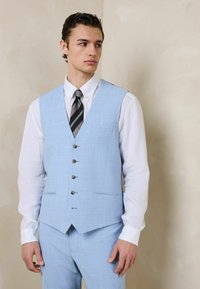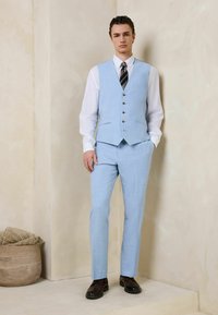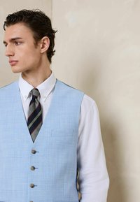 Jeune homme portant un gilet bleu clair et un pantalon avec une chemise blanche et une cravate rayée, debout devant un fond neutre.