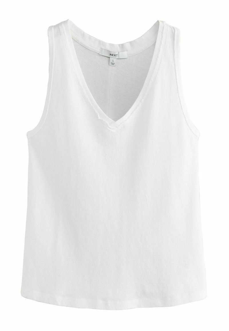 Haut blanc sans manches avec col en V et bordure cousue, taille petit, devant uni, en tissu léger.