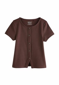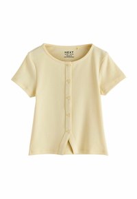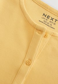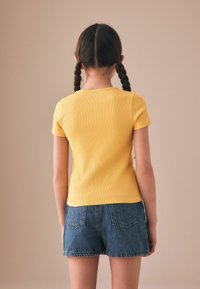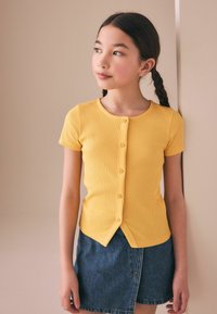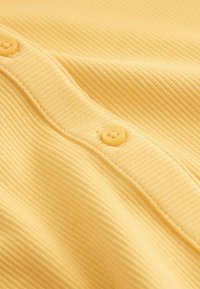 Gros plan d'une main ajustant l'ourlet d'une chemise jaune côtelée boutonnée portée sur un jean en denim bleu.