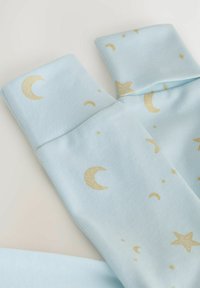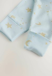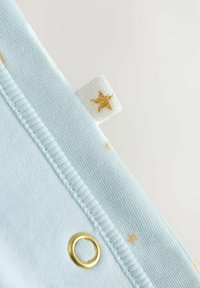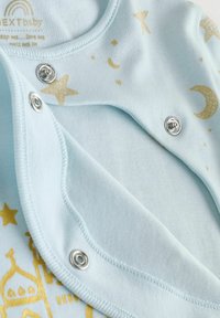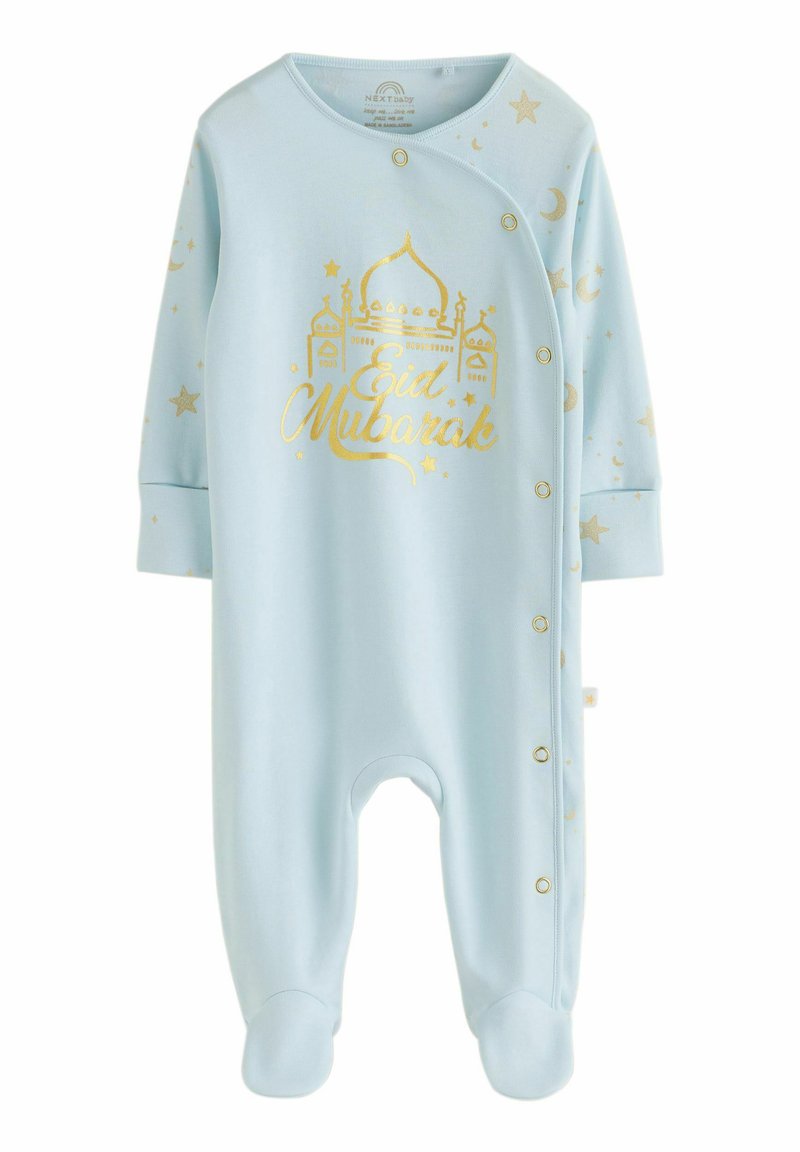 Body pour bébé en tissu bleu clair avec inscription dorée « Eid Mubarak » et motif de mosquée. Dispose de boutons-pression sur le côté ainsi que de motifs d'étoiles et de lune.