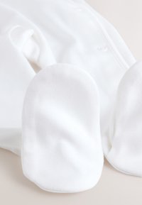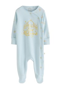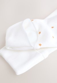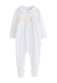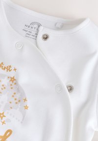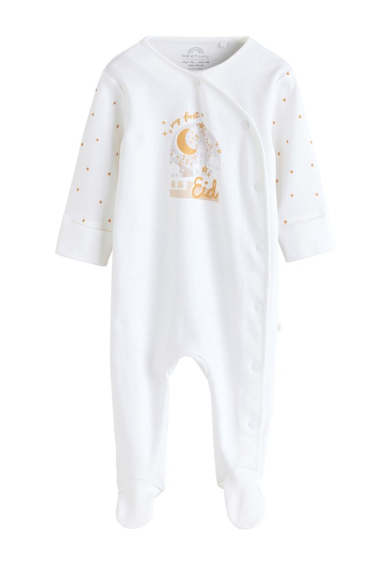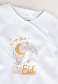 Body blanc pour bébé avec croissant de lune et étoiles dorées, texte « mon premier Eid », et boutons-pression devant et sur la jambe gauche.