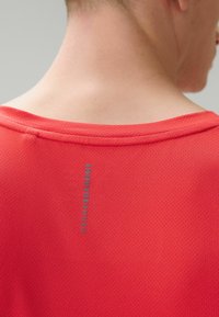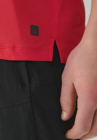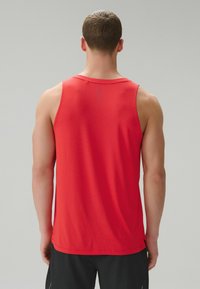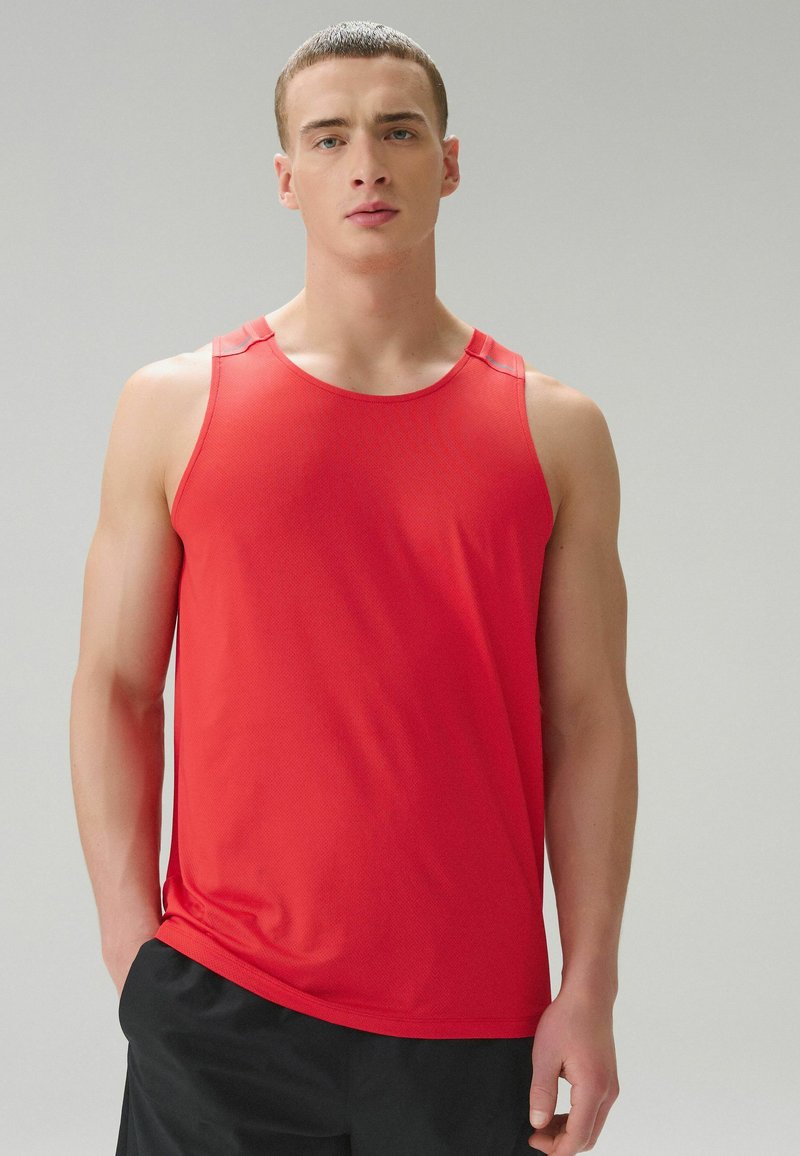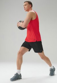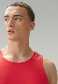 Jeune homme aux cheveux courts portant un débardeur de sport rouge et un short noir, debout devant un fond gris uni.