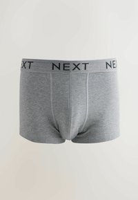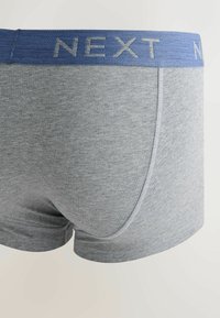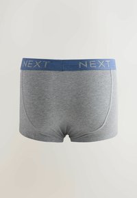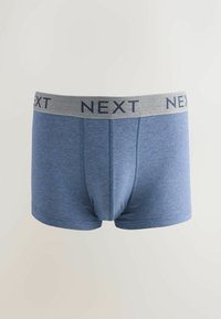 Dix paires de maillots de bain pour hommes de différentes couleurs : bleu clair, bleu foncé, gris et noir. Chaque modèle est doté d'une ceinture élastique avec la marque "NEXT".